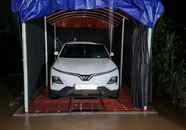 In Ha Tinh, a VinFast VF 6 owner gained attention for building a custom floating platform to safeguard their vehicle against rising floodwaters.