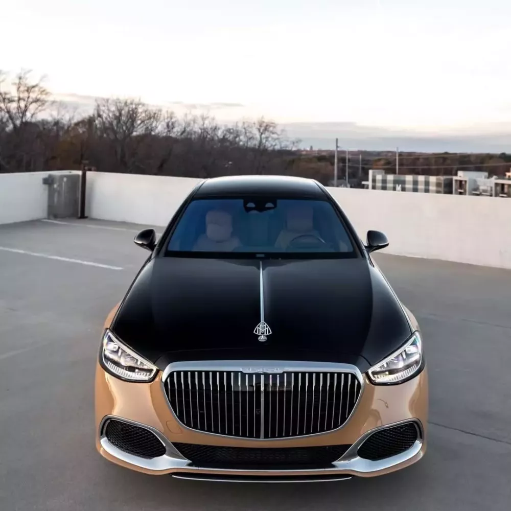 This special Mercedes-Maybach S680 features the signature Maybach wheels, with a light brown lower body, including the wheels, and a black upper body, separated by a subtle trim line.